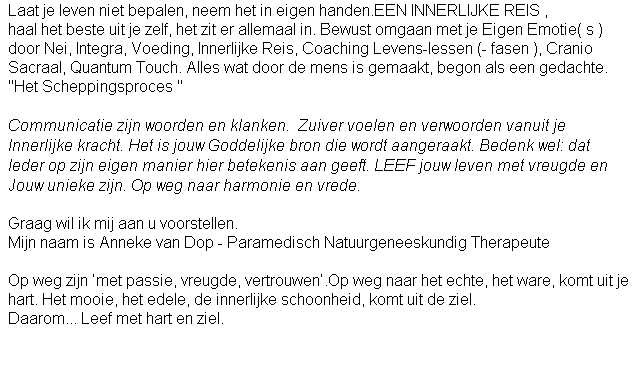 Door middel van NEI, Voeding, Cranio-Sacraal, Meditatie, Ismakogie, Bach,